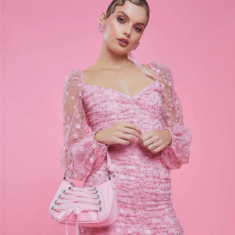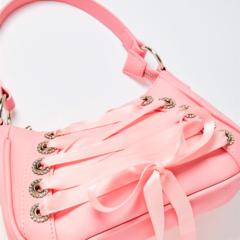 Bolsa hobo pequena rosa. O modelo tem formato estruturado e alongado, laterais arredondadas e acabamento liso. Traz alça tiracolo longa. Possui fecho em zíper e puxador, além de detalhe de aplicação amarração em cadarço de ceda na capa frontal.