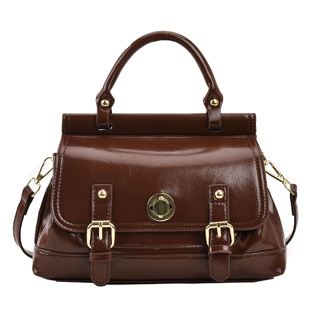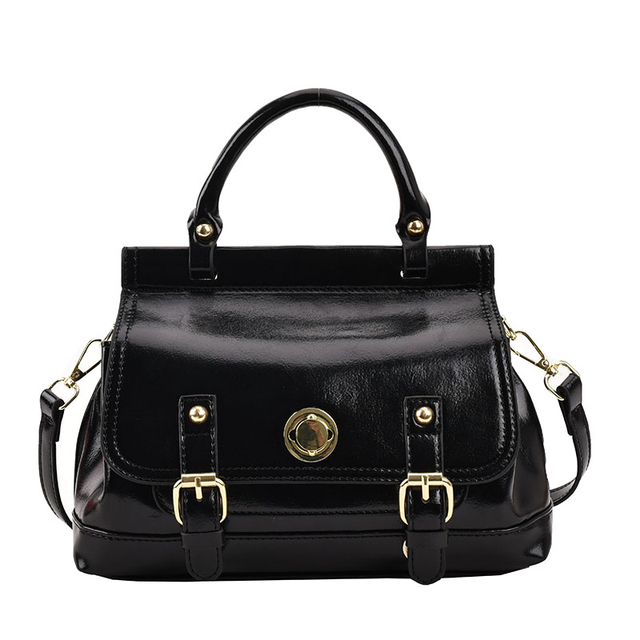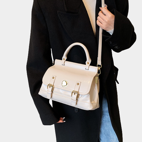 Bolsa satchel pequena. O modelo tem formato estruturado e laterais arredondadas. Traz alça de mão e tampo frontal com costuras marcadas e recorte geométrico. Com fecho em encaixe por peça de metal e bolso frontal abaixo do tampo.