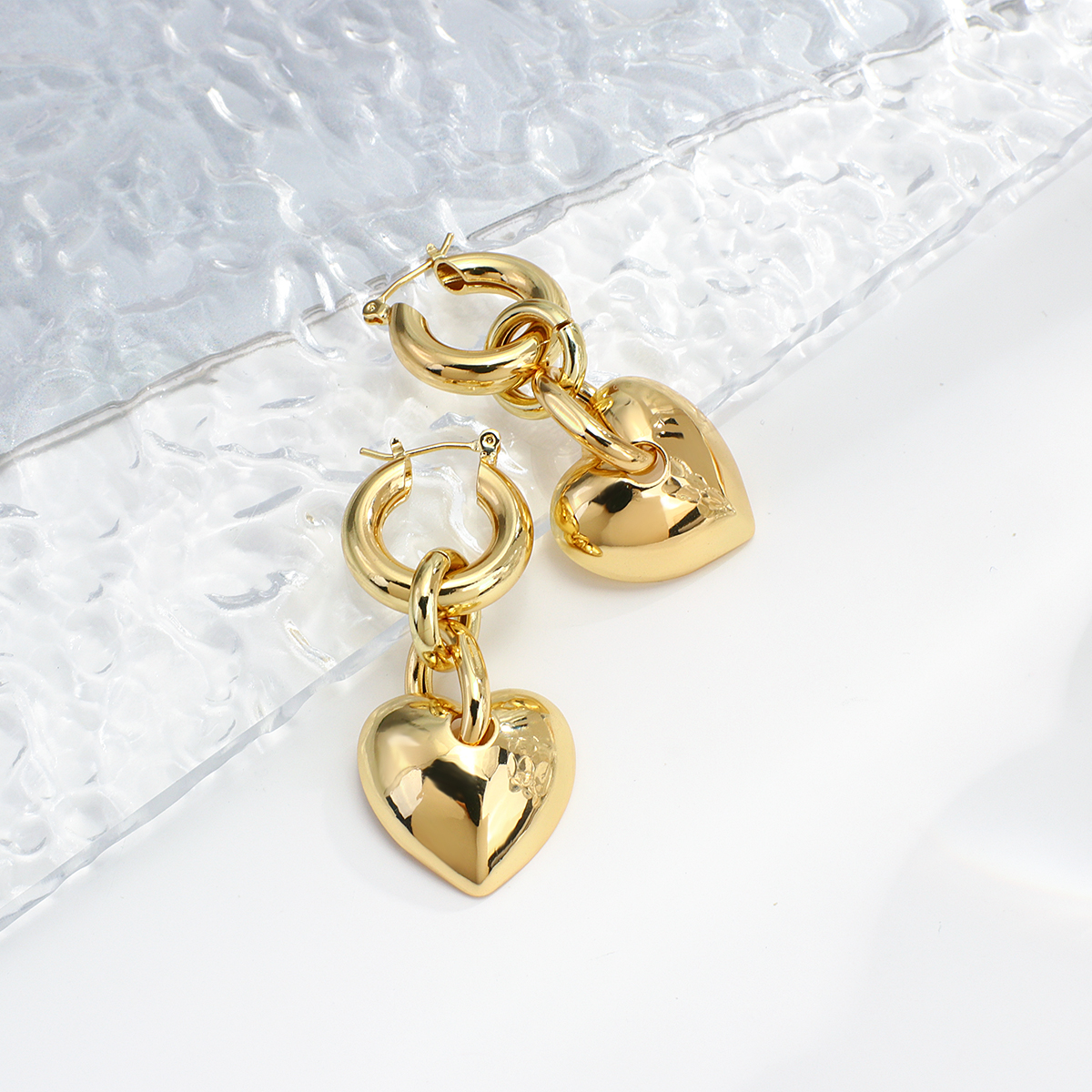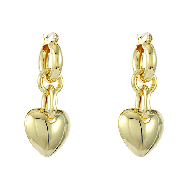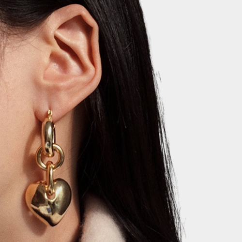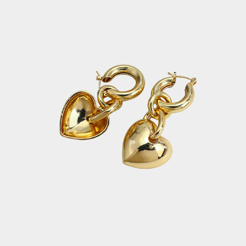 Par de brincos pêndulo médio. Design com pingente de coração oco em cobre. Acabamento banhado e fechamento por encaixe de alfinete.
