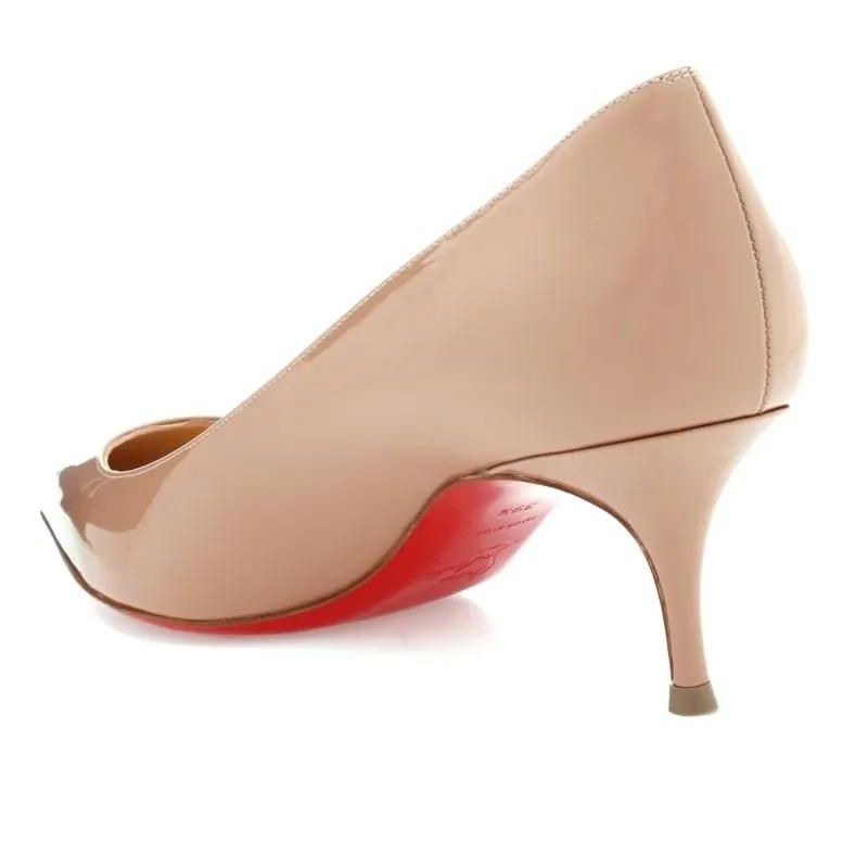 Scarpin bege de couro. O modelo tem salto médio fino e bico fino. Fechado, traz cabedal com recorte em V sobre o peito do pé e formato ajustado nas laterais, além de costura pesponto por todo o contorno. Com palmilha bege e sola em vermelho com antiderrapante.